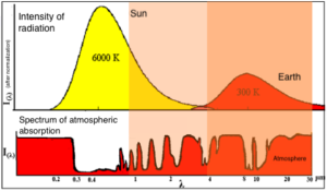 Emission spectrum of solar and terrestrial radiation and absorption spectrum of the Earth’s atmosphere (Source: ggeo.auth.gr).