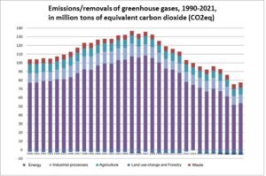 Annual national greenhouse gas emissions/absorptions from 1990 to 2021 (Source: Ministry of Environment and Energy, 2023).