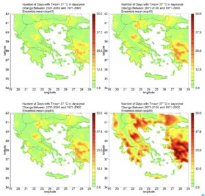 Changes in the number of days with maximum temperature > 37°C between 2031-2060 and 1971-2000 (left) and between 2071-2100 and 1971-2000 (right) in the case of a mitigation scenario of greenhouse gas emissions (RCP4.5, top) and in the case of a no-action scenario for the mitigation of greenhouse gas emissions (RCP8.5, bottom)