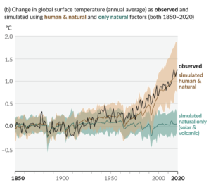 Comparison of observed global surface temperature changes with climate model simulations that include natural and anthropogenic (human-induced) forcings (Source: IPCC AR6 WG I).