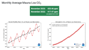 Increasing levels of carbon dioxide in the atmosphere from 1960 to 2023 according to measurements at the Mauna Loa Observatory in Hawaii (Source: : NOAA Global Monitoring Laboratory).