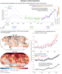 Indicators of a changing global climate system including: (a, c) the observed global mean of land and ocean surface temperature anomalies, and (b) a map illustrating the observed change in surface temperature from 1900 to 2020 (Source: IPCC AR6 WG I).