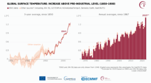 Increase in global air temperature (in degrees Celsius) above the pre-industrial mean for the reference period 1850-1900, based on numerous global temperature datasets, presented as:(left) five-year means from 1850, and (right) annual means from 1967 (Source: C3S/ECMWF).